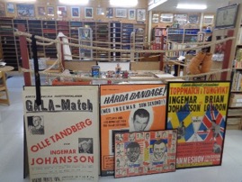 Rolf Johansson berättade om sin stora samling av idrottshistoriskt material. En yta på 200 kvadratmeter i två våningar, fylld av tidningar, affischer, böcker, bilder m.m. En fantastisk samling. Deltagarna fick sedan tid för att botanisera runt i hela denna stora samling. Några deltagare hittade material från sin förening och stannade upp där och några hittade ett klassiskt ishockeyspel och passade på att ta en match. De flesta vandrade runt i den imponerande samlingen och stannade upp vid något som kändes extra intressant. Det blev en timma i denna fantastiska idrottssamling innan det var dags för kaffestunden där SISU Idrottsutbildarna bjöd på en god Prinsesstårta.