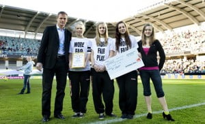 090425 Fotboll, dam, Sverige – Brasilien: Torbjörn Nilsson delar ut ett pris för Svenska Spel, Fair Play, IFK UmeÃ¥ f94 fick det.